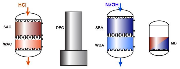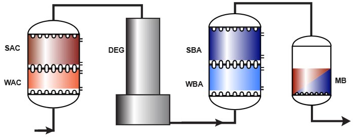 Полная линия обессоливания показана ниже: колонна катионного обмена (СлКК/СКК), дегазатор, колонна анионного обмена (СлОА/СОА) и полирующий фильтр смешанного действия. Использование слабокислотной смолы и дегазатора обусловлено наличием жёсткости и щёлочности в исходной воде, как объяснялось в предыдущих разделах.